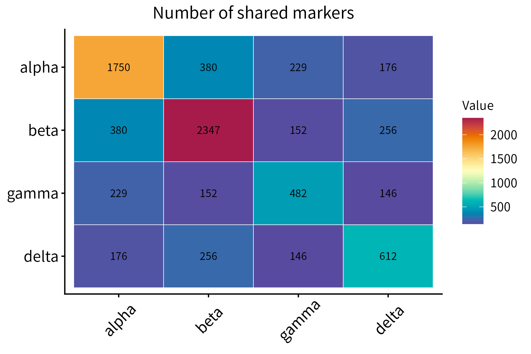 In the example below, it represents the significance of pairs of overlaps between the markers of groups belonging to two identity classes (cell type and donor).