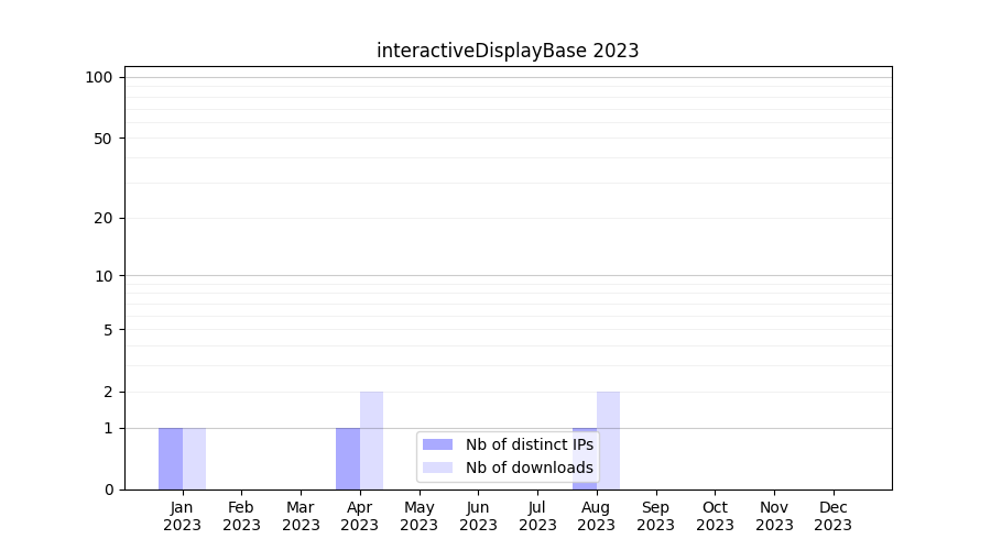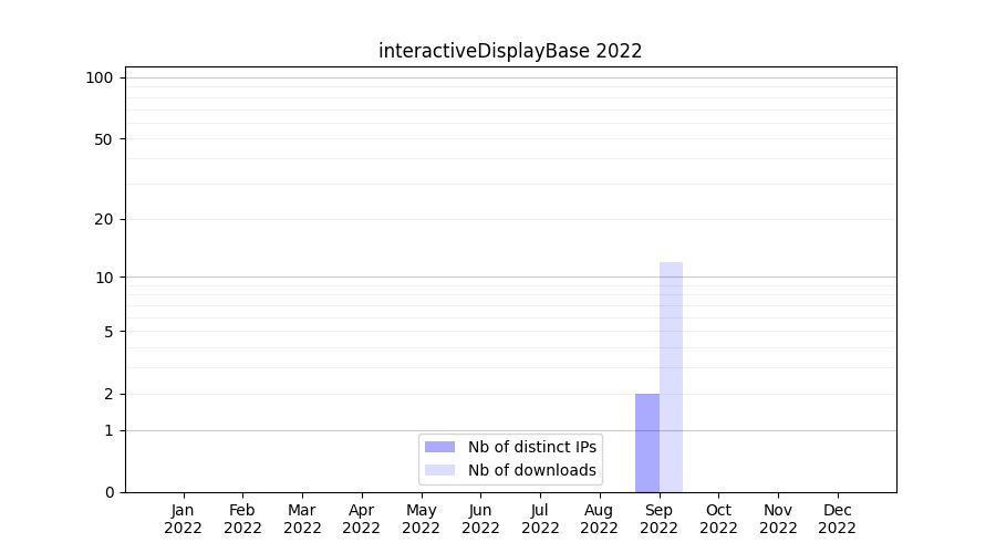Number of downloads for experiment package interactiveDisplayBase, year by year, from 2025 back to 2014 (years with no downloads are omitted):