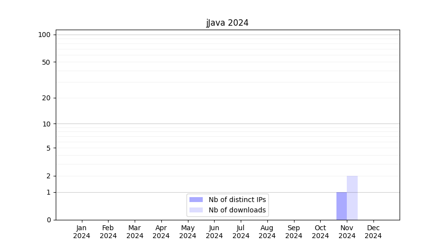 Number of downloads for experiment package jJava, year by year, from 2025 back to 2014 (years with no downloads are omitted):