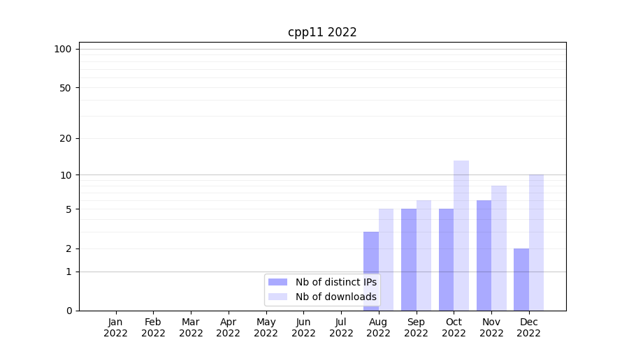 Number of downloads for workflow package cpp11, year by year, from 2025 back to 2015 (years with no downloads are omitted):