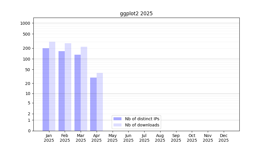 Number of downloads for workflow package ggplot2, year by year, from 2025 back to 2015 (years with no downloads are omitted):