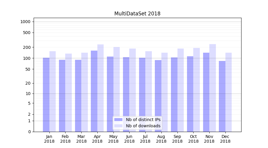 Number of downloads for software package MultiDataSet, year by year, from 2025 back to 2014 (years with no downloads are omitted):