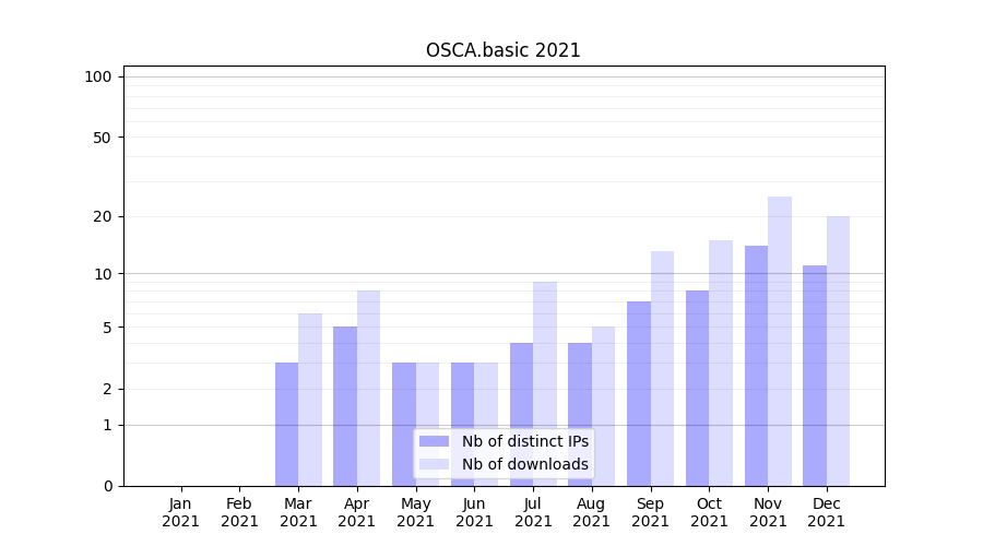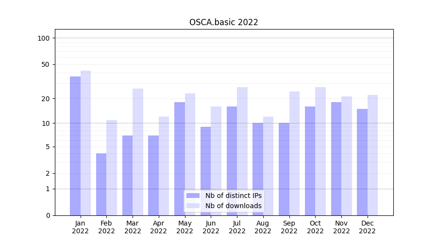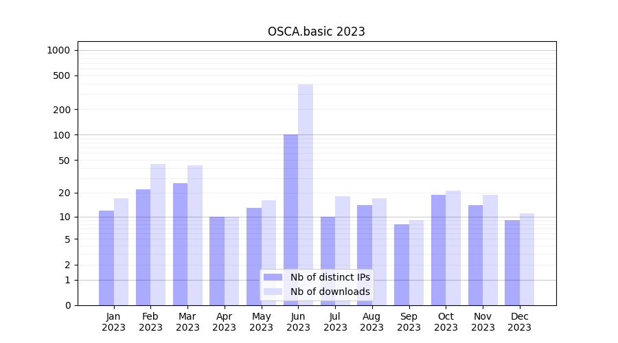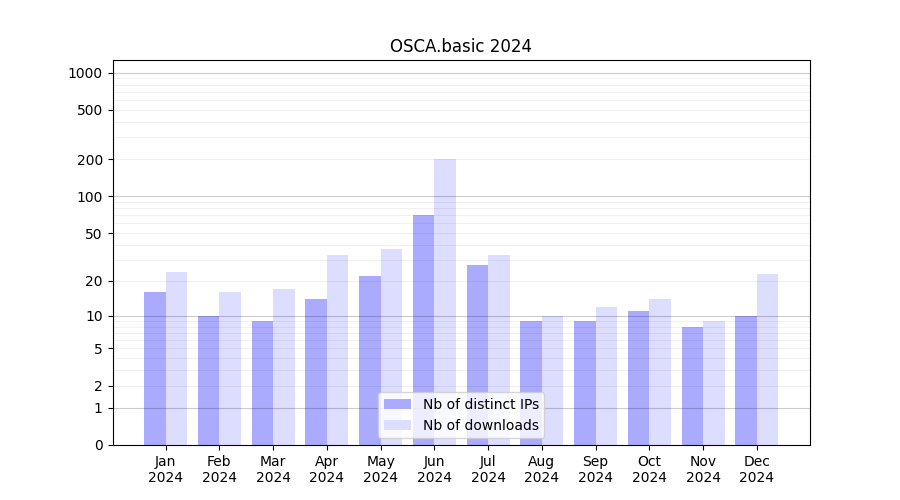 Number of downloads for software package OSCA.basic, year by year, from 2025 back to 2014 (years with no downloads are omitted):
