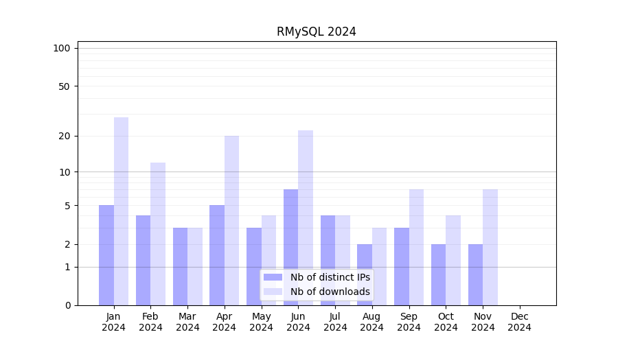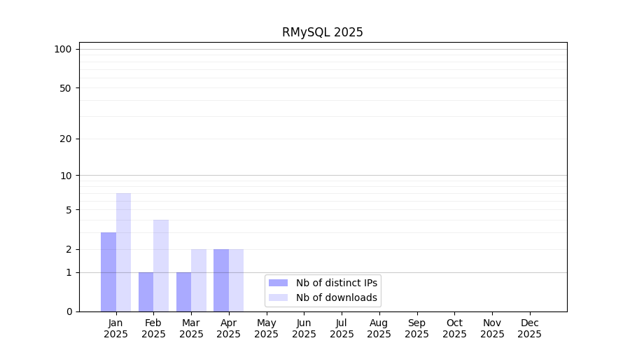 Number of downloads for software package RMySQL, year by year, from 2025 back to 2014 (years with no downloads are omitted):
