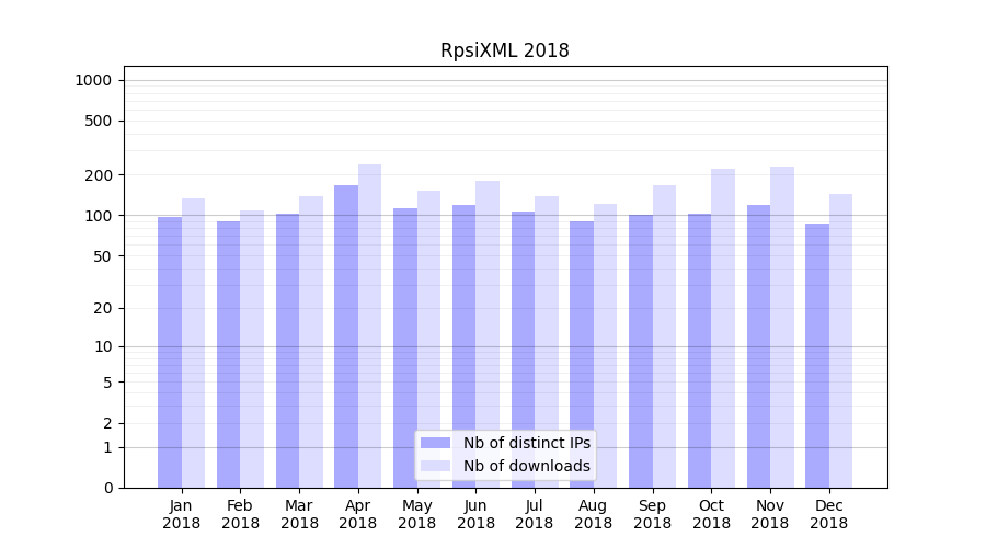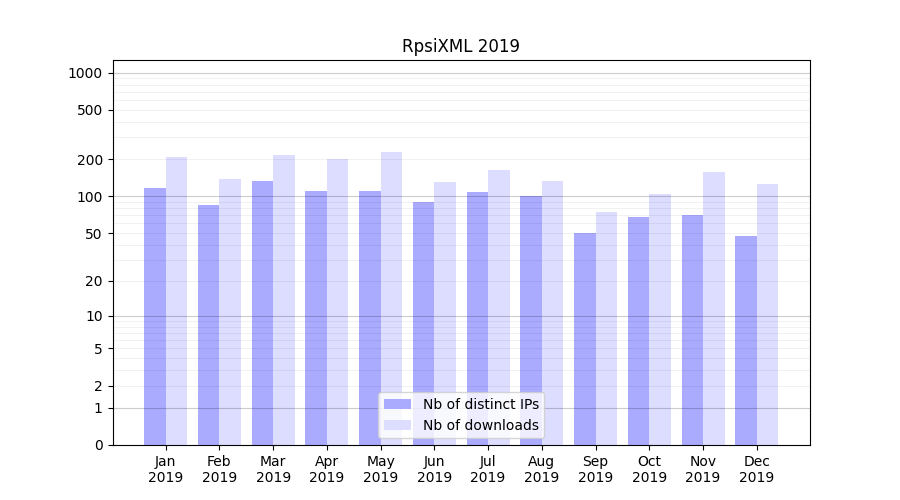 Number of downloads for software package RpsiXML, year by year, from 2025 back to 2014 (years with no downloads are omitted):