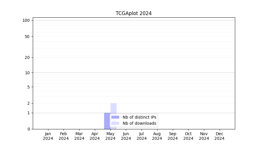 Number of downloads for software package TCGAplot, year by year, from 2025 back to 2014 (years with no downloads are omitted):