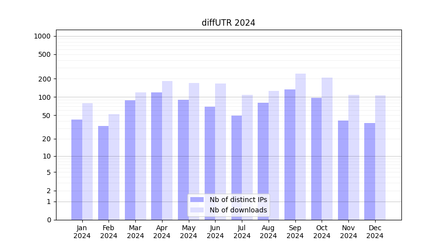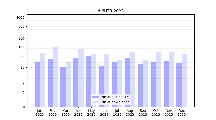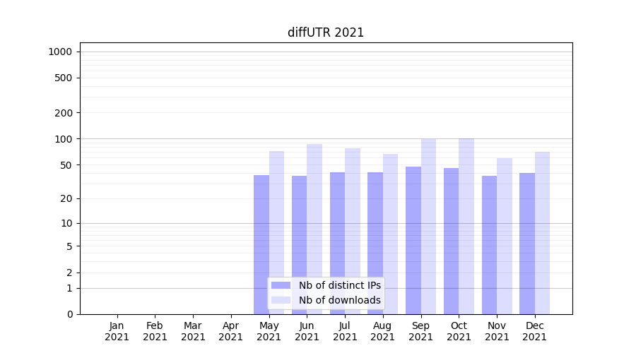 Number of downloads for software package diffUTR, year by year, from 2025 back to 2014 (years with no downloads are omitted):