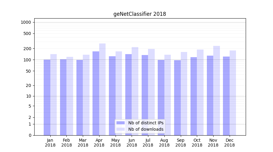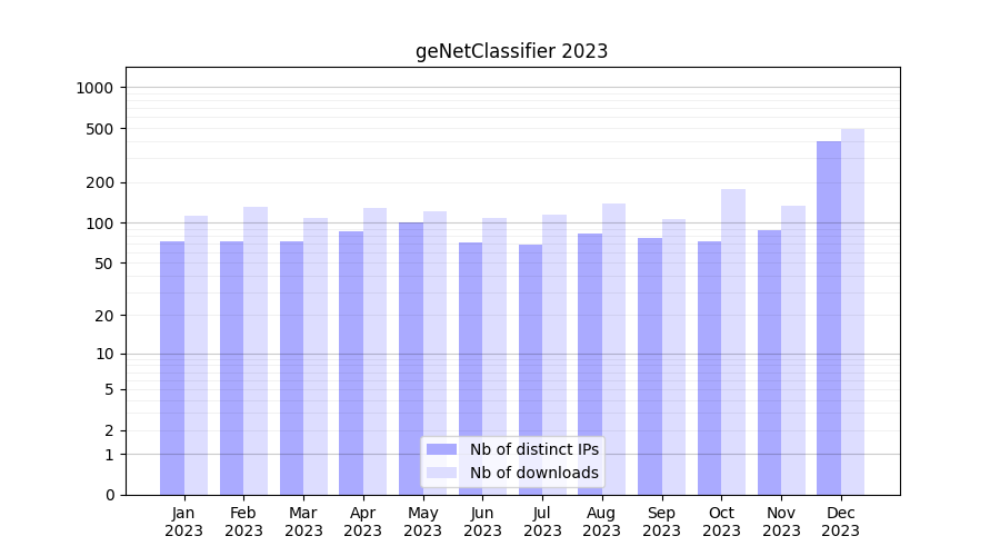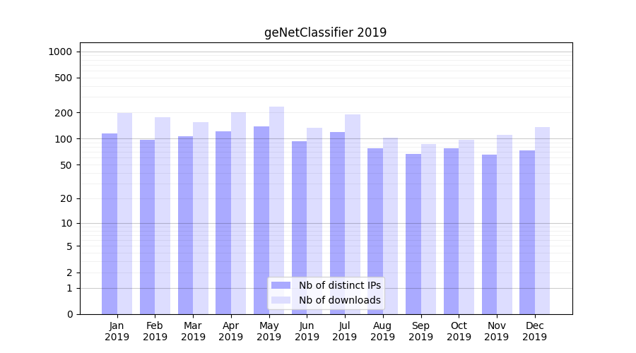 Number of downloads for software package geNetClassifier, year by year, from 2025 back to 2014 (years with no downloads are omitted):