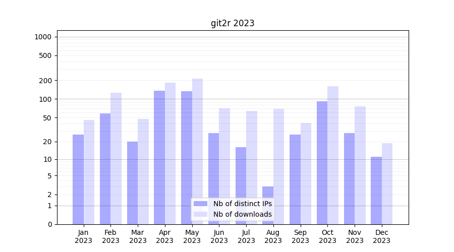 Number of downloads for software package git2r, year by year, from 2025 back to 2014 (years with no downloads are omitted):