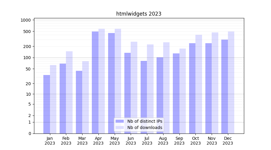Number of downloads for software package htmlwidgets, year by year, from 2025 back to 2014 (years with no downloads are omitted):