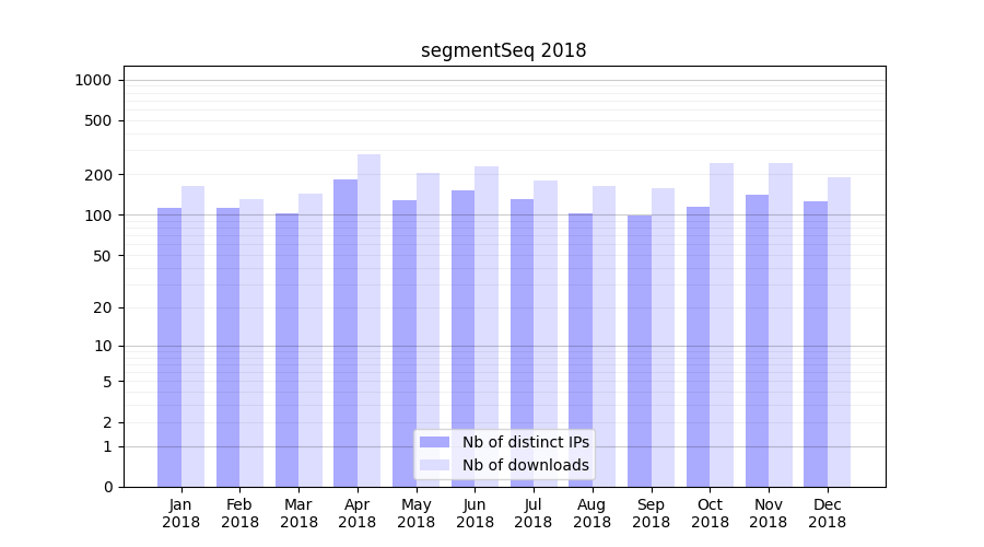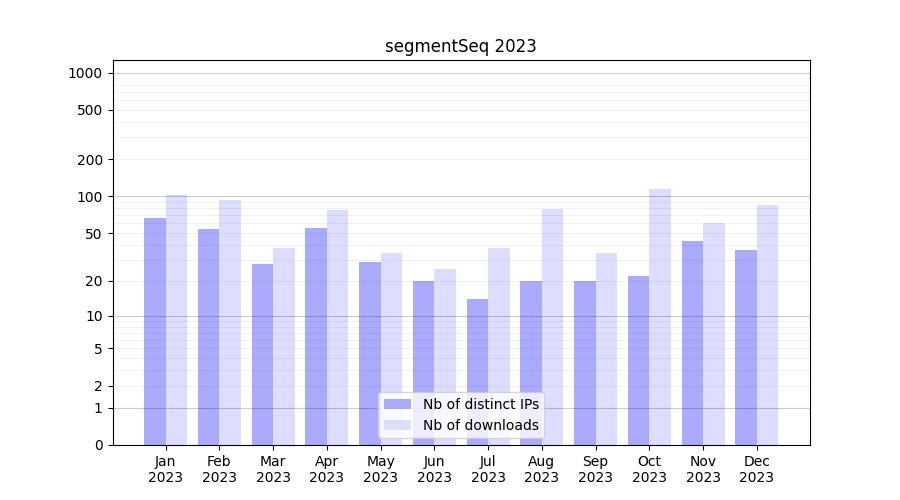 Number of downloads for software package segmentSeq, year by year, from 2025 back to 2014 (years with no downloads are omitted):