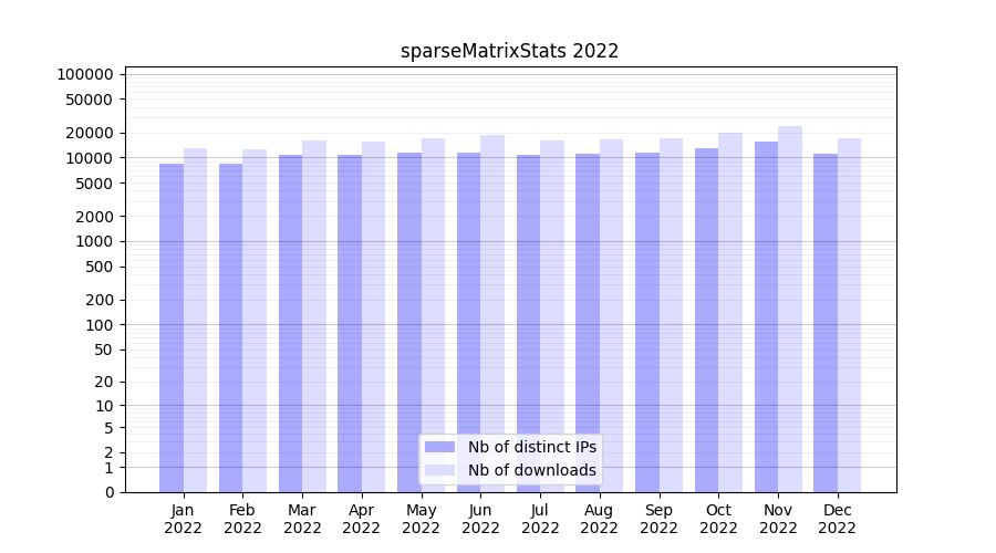 Number of downloads for software package sparseMatrixStats, year by year, from 2025 back to 2014 (years with no downloads are omitted):