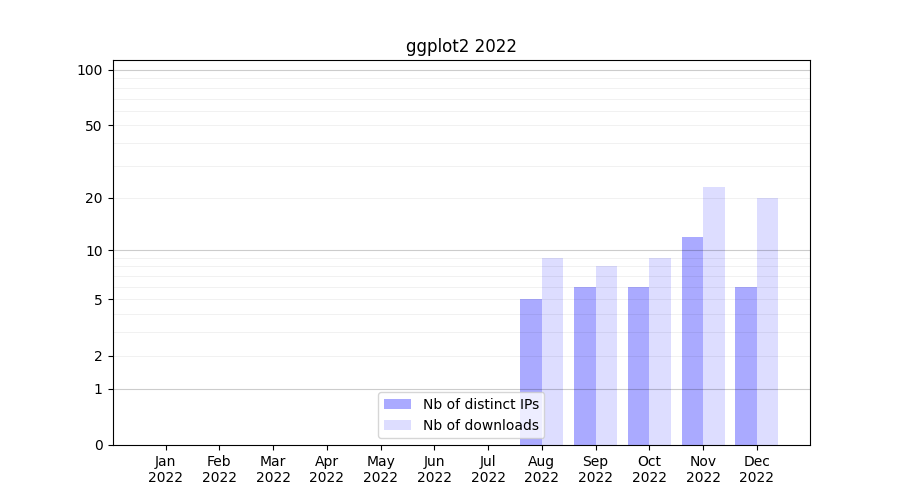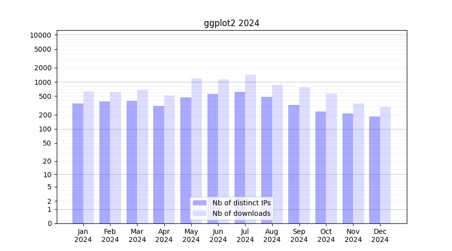 Number of downloads for annotation package ggplot2, year by year, from 2025 back to 2014 (years with no downloads are omitted):