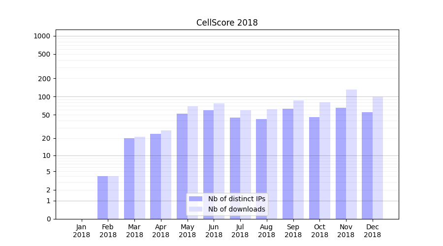 Number of downloads for software package CellScore, year by year, from 2025 back to 2014 (years with no downloads are omitted):
