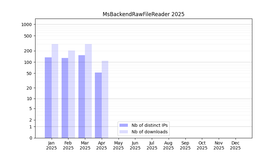 Number of downloads for software package MsBackendRawFileReader, year by year, from 2025 back to 2014 (years with no downloads are omitted):
