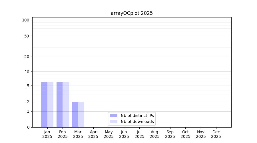 Number of downloads for software package arrayQCplot, year by year, from 2025 back to 2014 (years with no downloads are omitted):