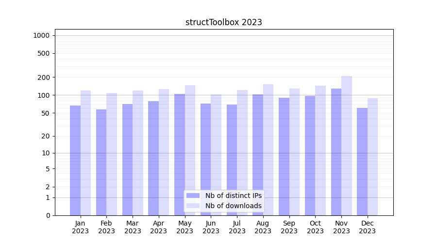 Number of downloads for software package structToolbox, year by year, from 2025 back to 2014 (years with no downloads are omitted):