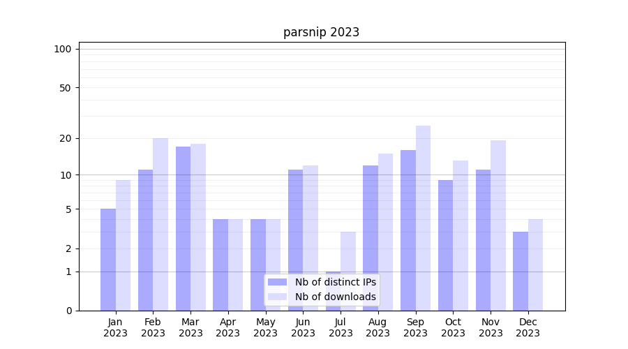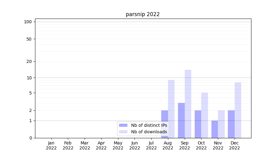 Number of downloads for annotation package parsnip, year by year, from 2025 back to 2014 (years with no downloads are omitted):