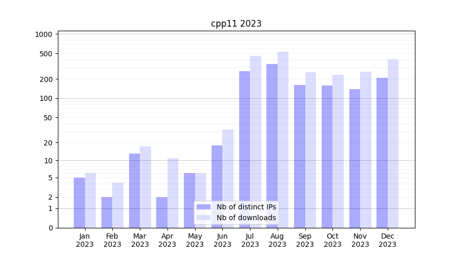 Number of downloads for workflow package cpp11, year by year, from 2025 back to 2015 (years with no downloads are omitted):