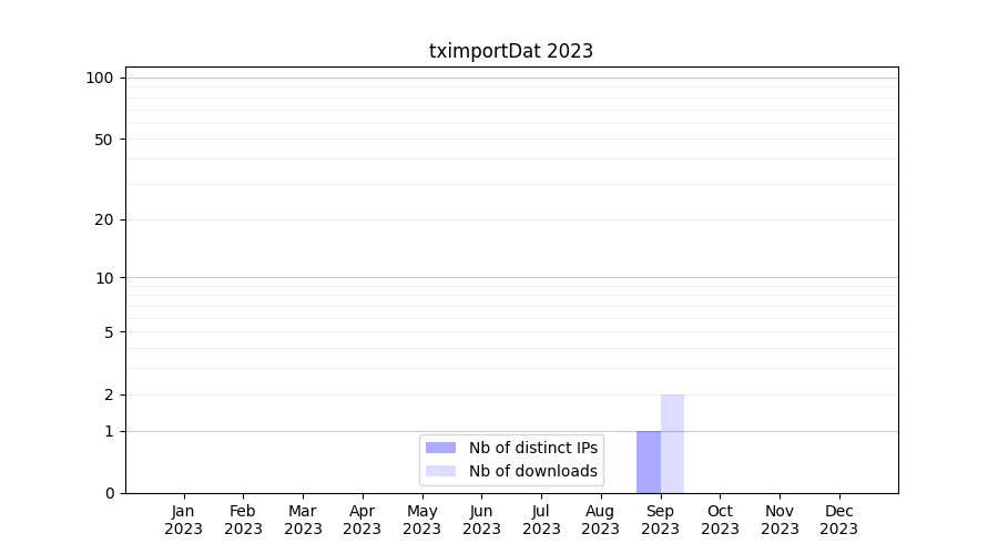 Number of downloads for workflow package tximportDat, year by year, from 2025 back to 2015 (years with no downloads are omitted):