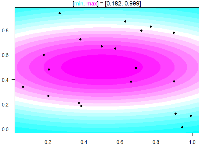 Using data with two inputs and an output, fit a Gaussian process model and show the contour surface with dots where the points are: