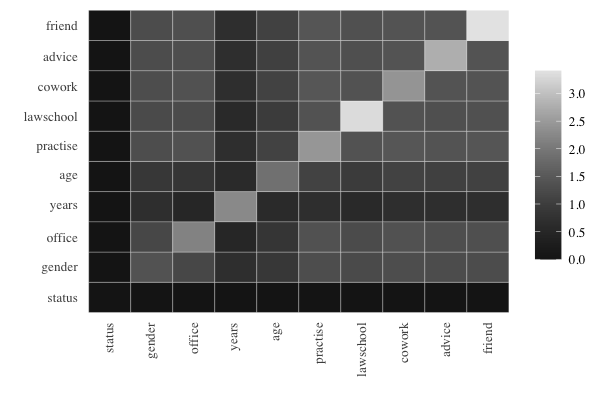 df.att <- lawdata[[4]]A requirement for the applicability of these entropy tools is the specification of discrete variables with finite range spaces on the same domain: either node attributes/vertex variables, edges/dyad variables or triad variables. These can be either observed or transformed as shown in the following using the above example data set.