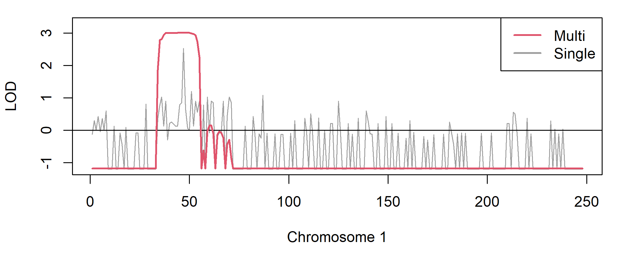 Furthermore, plot() produces a nice graph of the LOD scores: