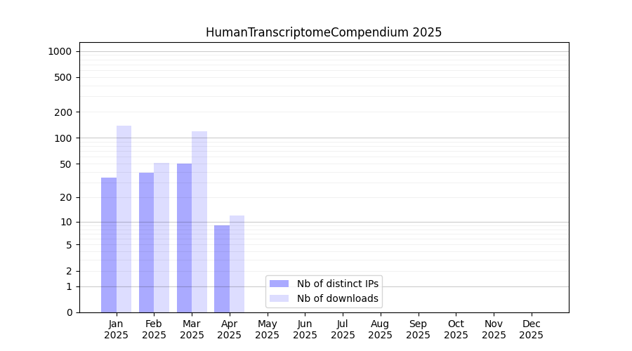 Number of downloads for software package HumanTranscriptomeCompendium, year by year, from 2025 back to 2014 (years with no downloads are omitted):