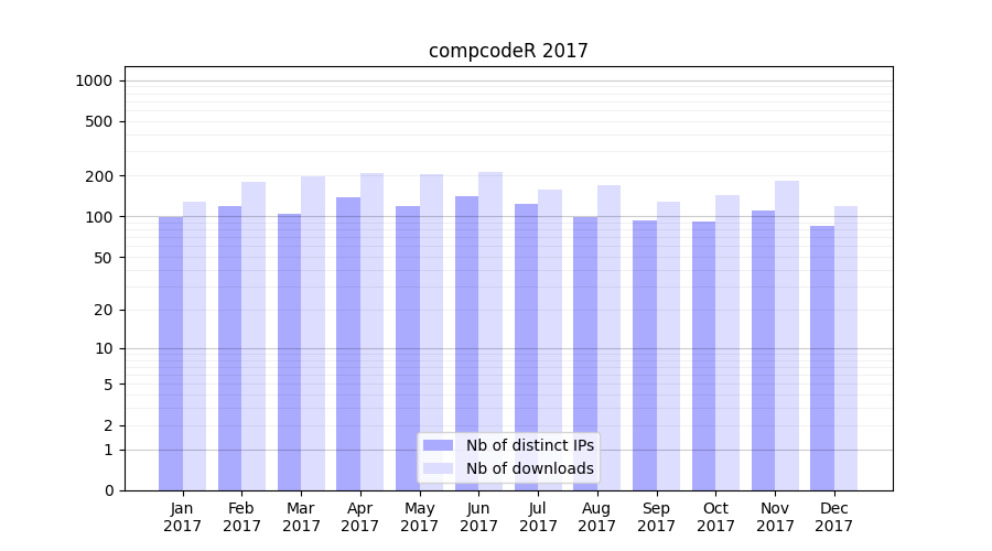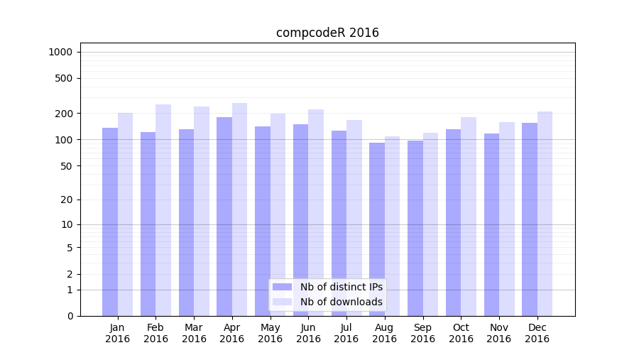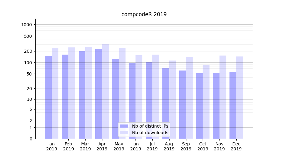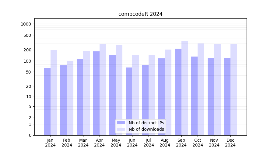 Number of downloads for software package compcodeR, year by year, from 2025 back to 2014 (years with no downloads are omitted):
