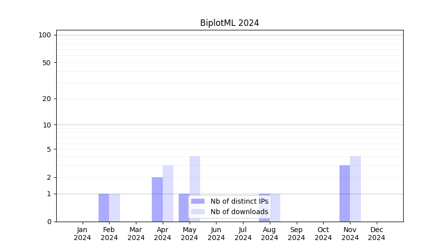 Number of downloads for annotation package BiplotML, year by year, from 2025 back to 2014 (years with no downloads are omitted):