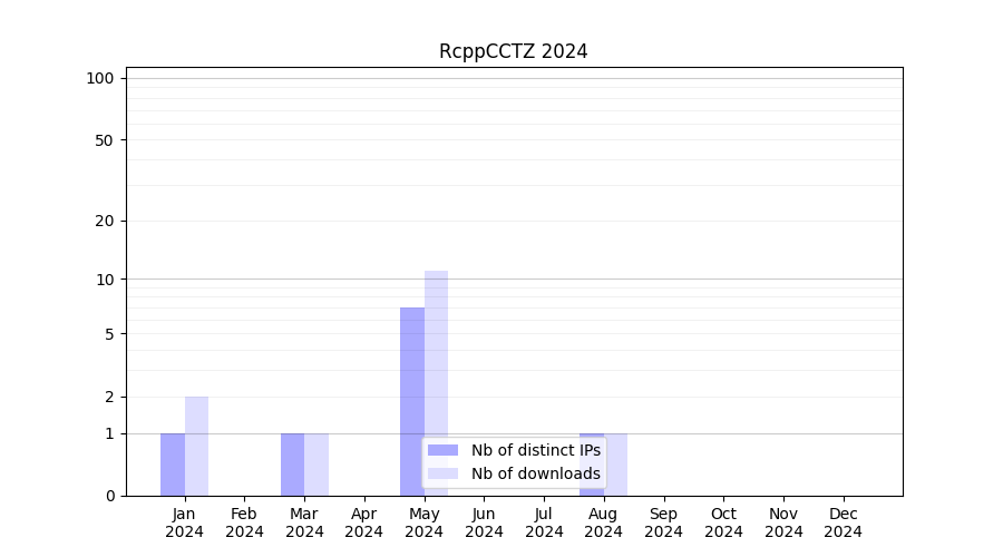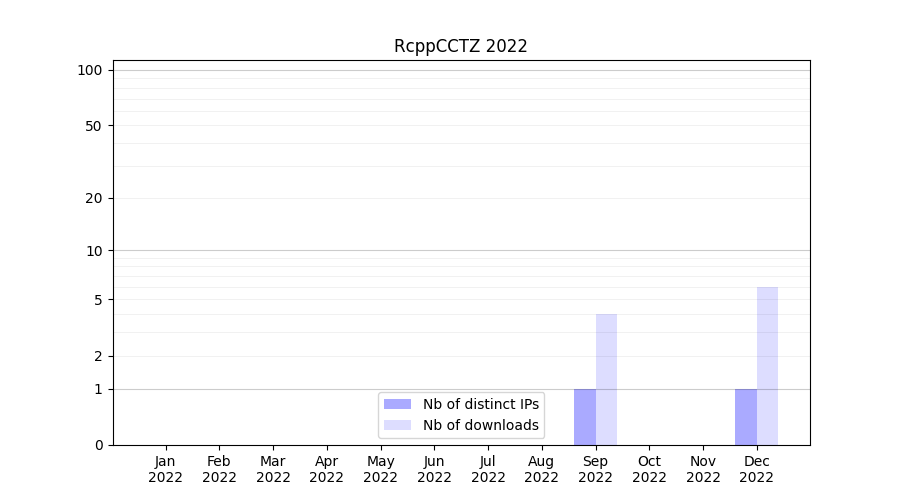 Number of downloads for annotation package RcppCCTZ, year by year, from 2025 back to 2014 (years with no downloads are omitted):