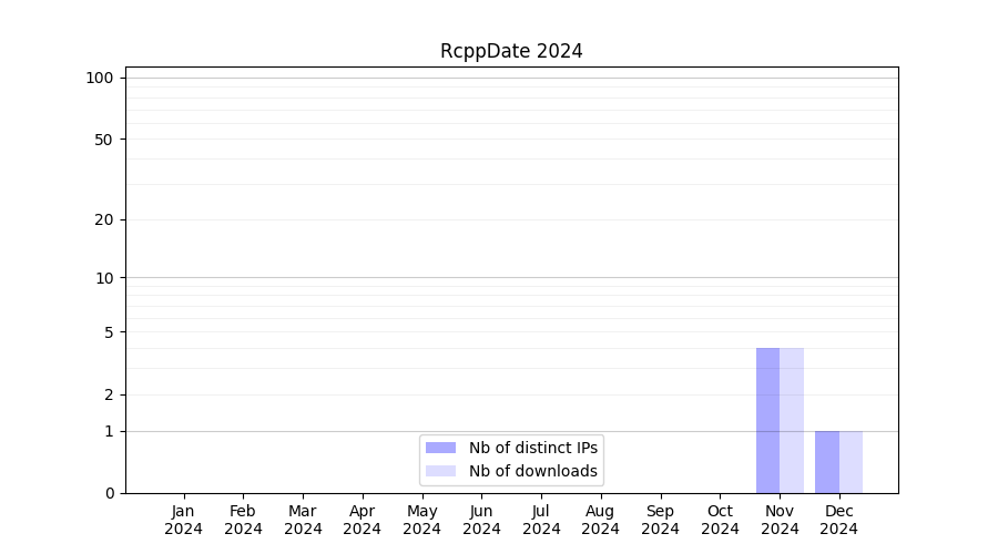 Number of downloads for annotation package RcppDate, year by year, from 2025 back to 2014 (years with no downloads are omitted):