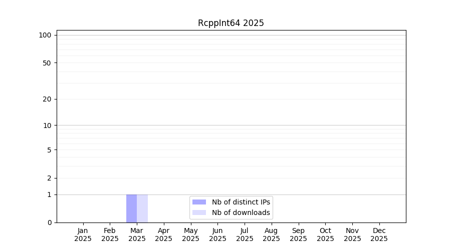 Number of downloads for annotation package RcppInt64, year by year, from 2025 back to 2014 (years with no downloads are omitted):