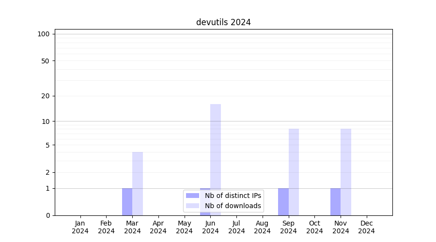 Number of downloads for annotation package devutils, year by year, from 2025 back to 2014 (years with no downloads are omitted):