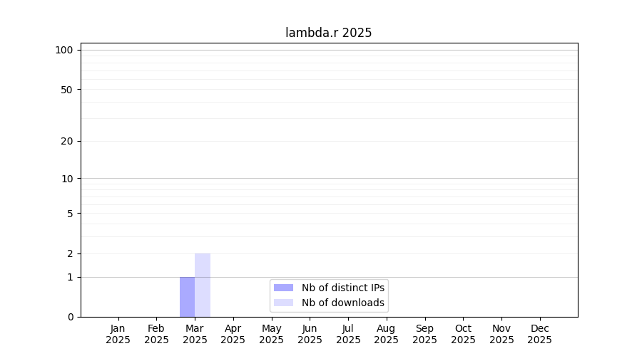 Number of downloads for annotation package lambda.r, year by year, from 2025 back to 2014 (years with no downloads are omitted):