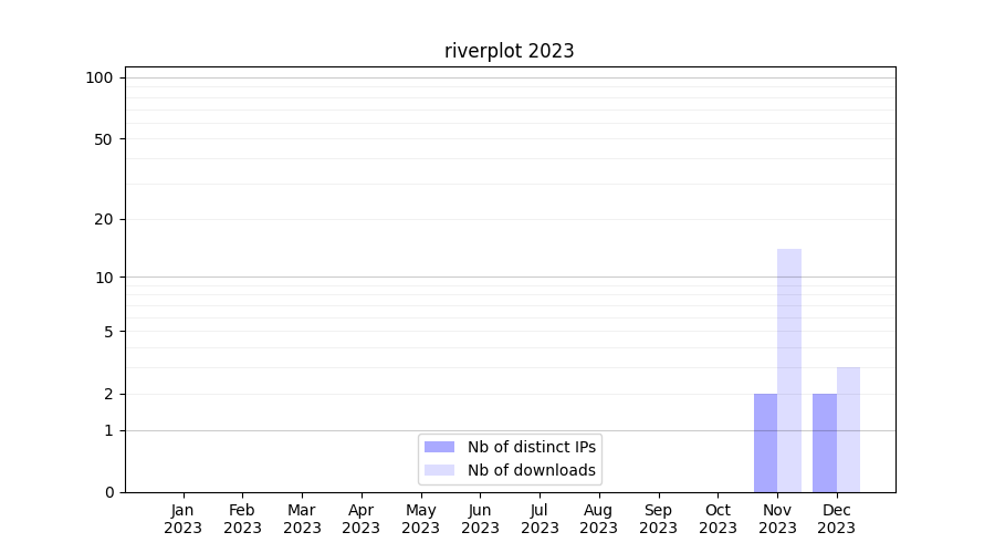 Number of downloads for annotation package riverplot, year by year, from 2025 back to 2014 (years with no downloads are omitted):