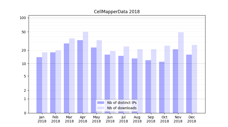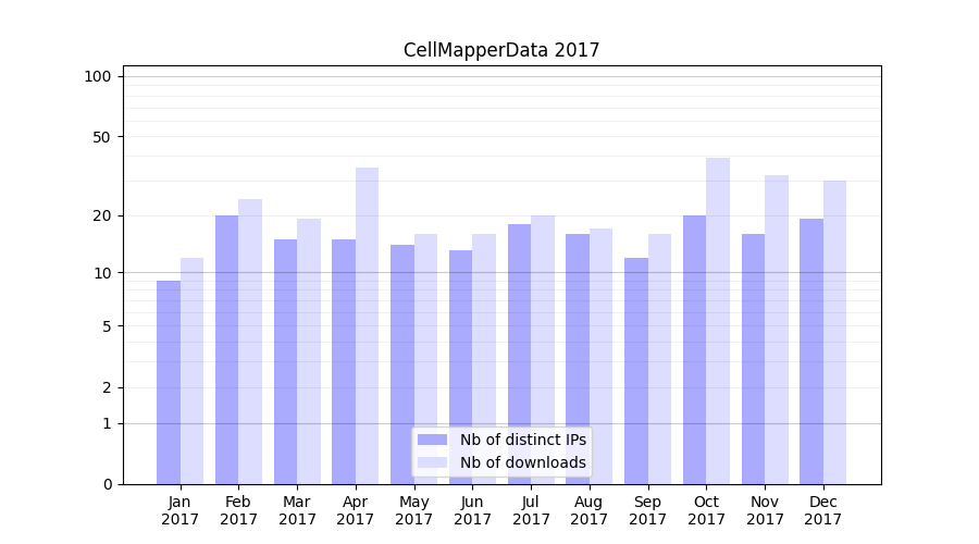 Number of downloads for experiment package CellMapperData, year by year, from 2025 back to 2014 (years with no downloads are omitted):