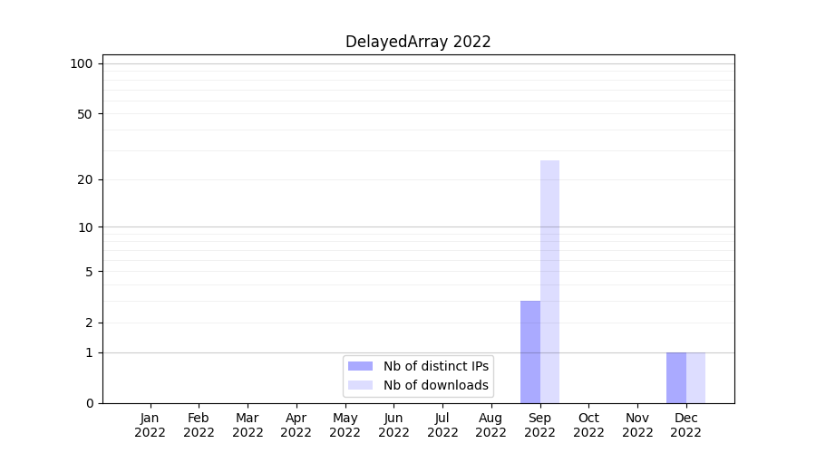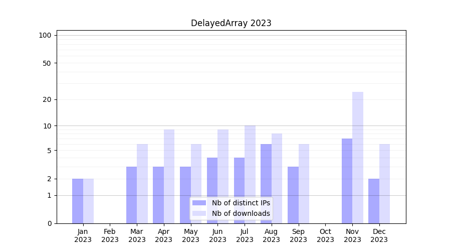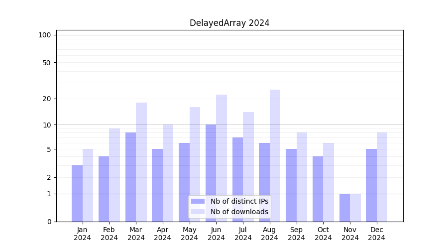 Number of downloads for experiment package DelayedArray, year by year, from 2025 back to 2014 (years with no downloads are omitted):