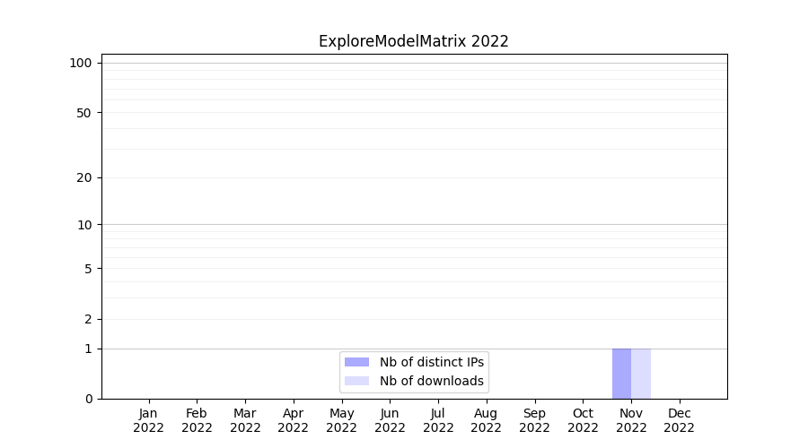 Number of downloads for experiment package ExploreModelMatrix, year by year, from 2025 back to 2014 (years with no downloads are omitted):