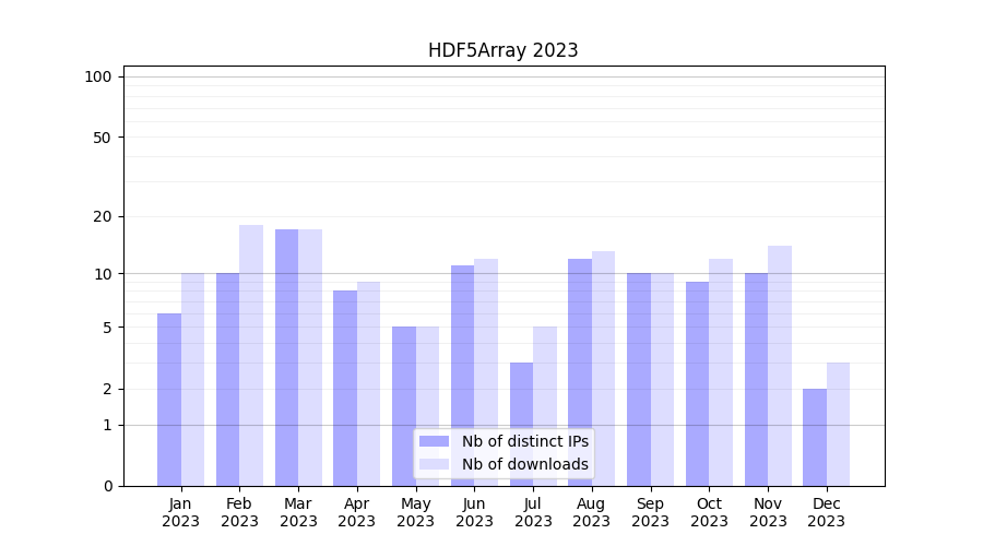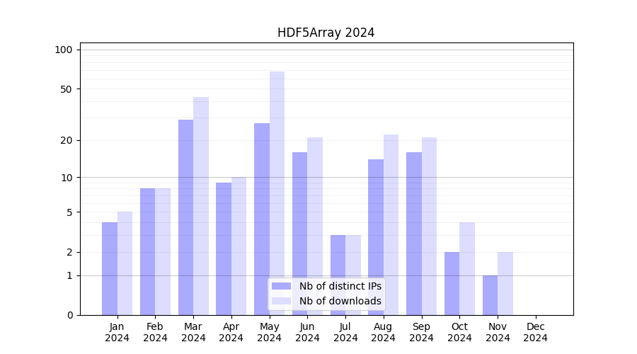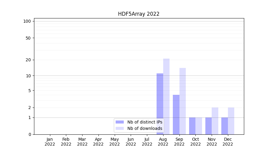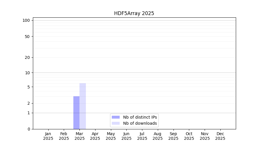 Number of downloads for experiment package HDF5Array, year by year, from 2025 back to 2014 (years with no downloads are omitted):