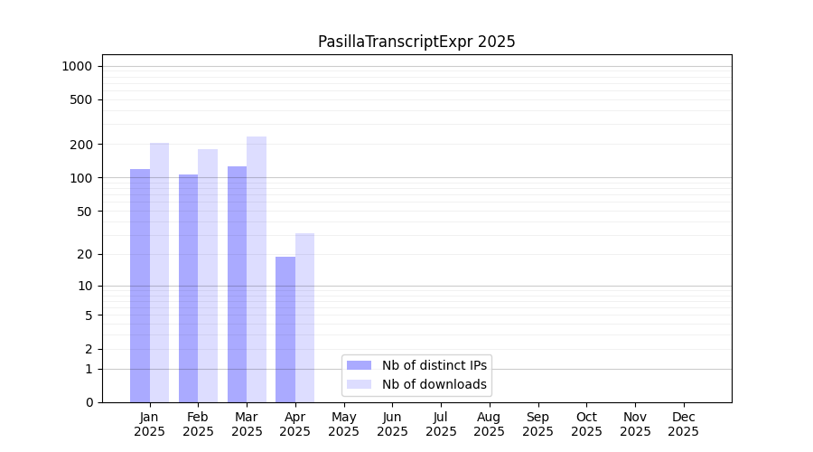Number of downloads for experiment package PasillaTranscriptExpr, year by year, from 2025 back to 2014 (years with no downloads are omitted):