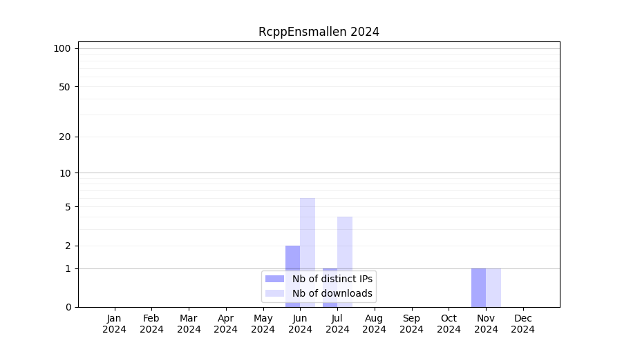 Number of downloads for experiment package RcppEnsmallen, year by year, from 2025 back to 2014 (years with no downloads are omitted):