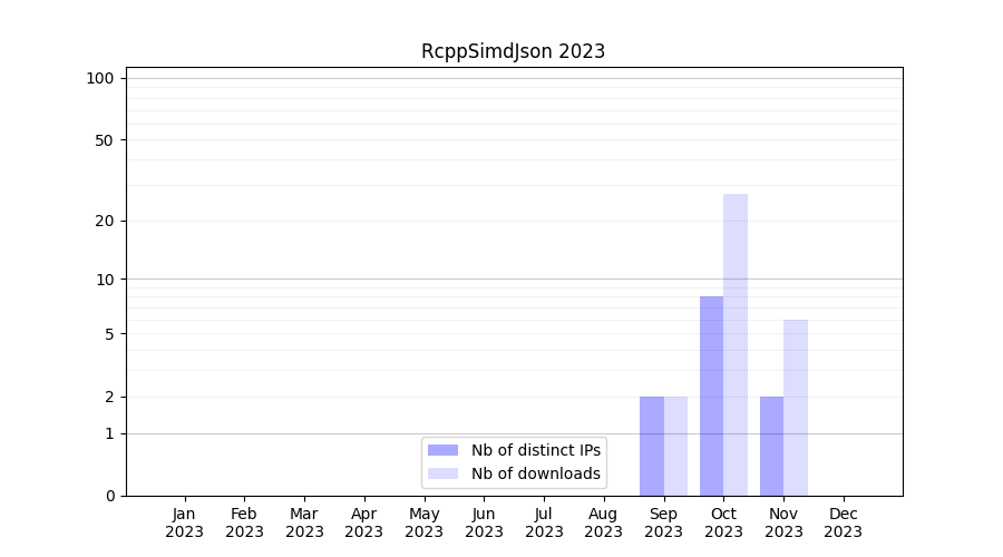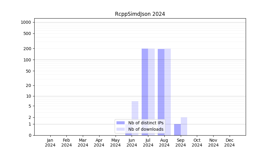 Number of downloads for experiment package RcppSimdJson, year by year, from 2025 back to 2014 (years with no downloads are omitted):