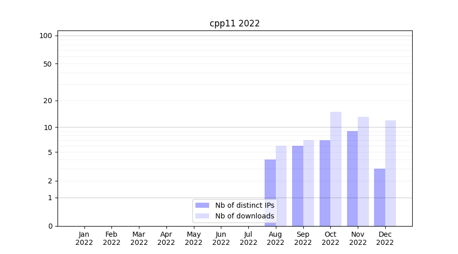 Number of downloads for experiment package cpp11, year by year, from 2025 back to 2014 (years with no downloads are omitted):