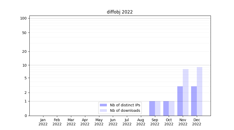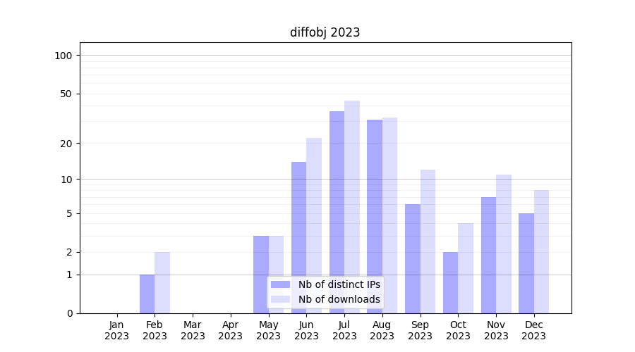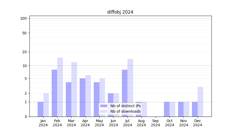 Number of downloads for experiment package diffobj, year by year, from 2025 back to 2014 (years with no downloads are omitted):