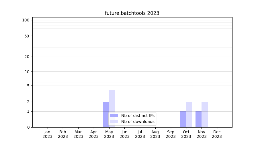 Number of downloads for experiment package future.batchtools, year by year, from 2025 back to 2014 (years with no downloads are omitted):