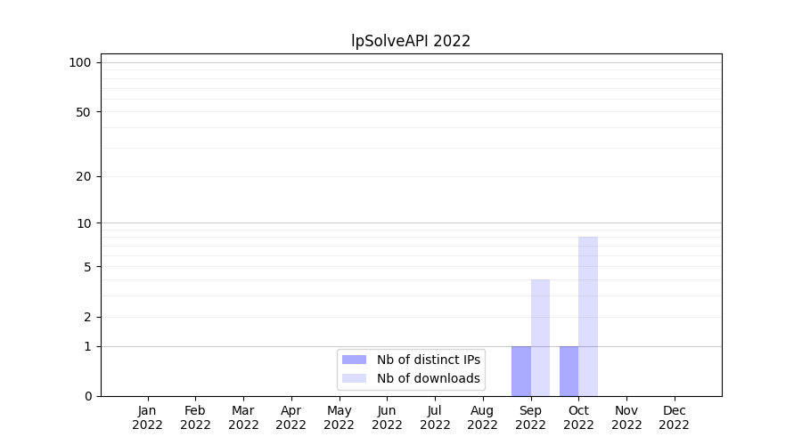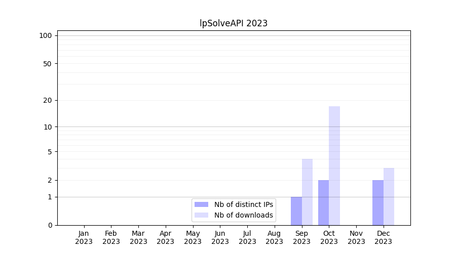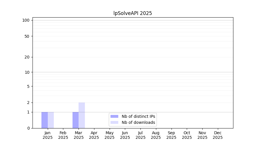 Number of downloads for experiment package lpSolveAPI, year by year, from 2025 back to 2014 (years with no downloads are omitted):