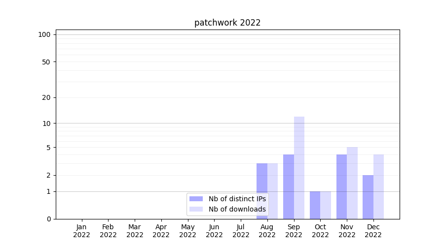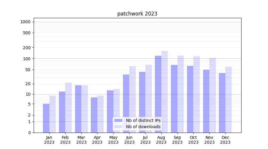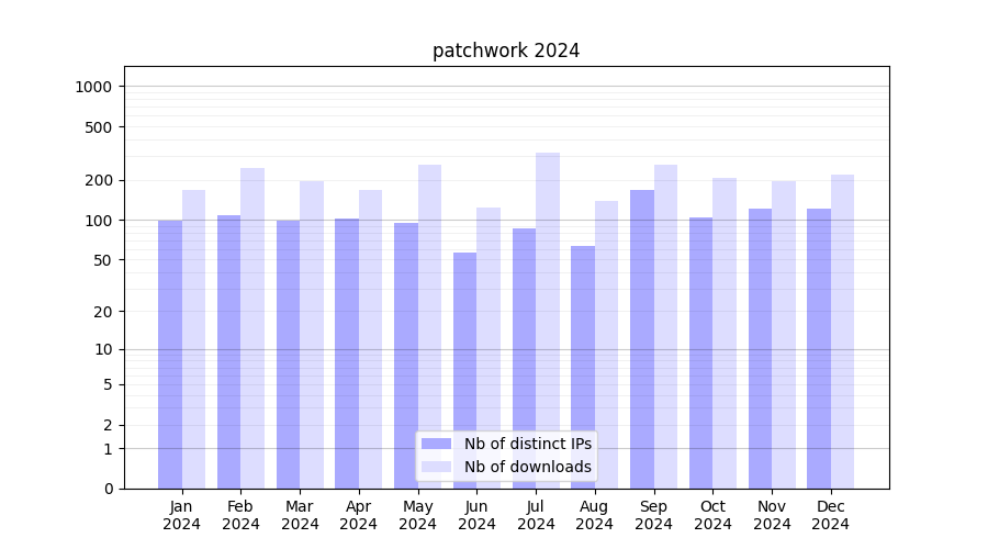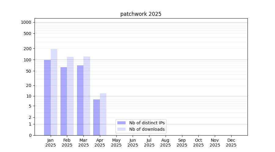 Number of downloads for experiment package patchwork, year by year, from 2025 back to 2014 (years with no downloads are omitted):