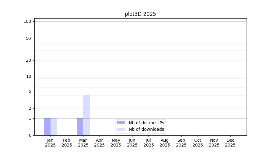 Number of downloads for experiment package plot3D, year by year, from 2025 back to 2014 (years with no downloads are omitted):