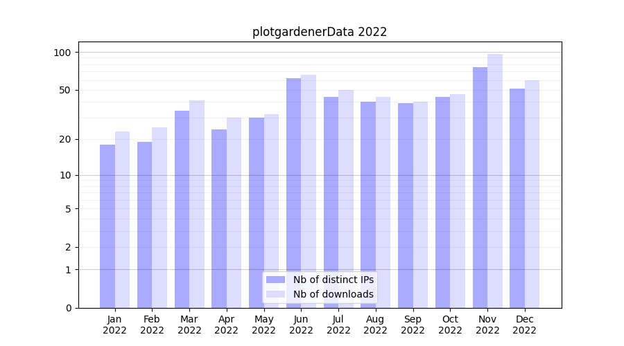 Number of downloads for experiment package plotgardenerData, year by year, from 2025 back to 2014 (years with no downloads are omitted):